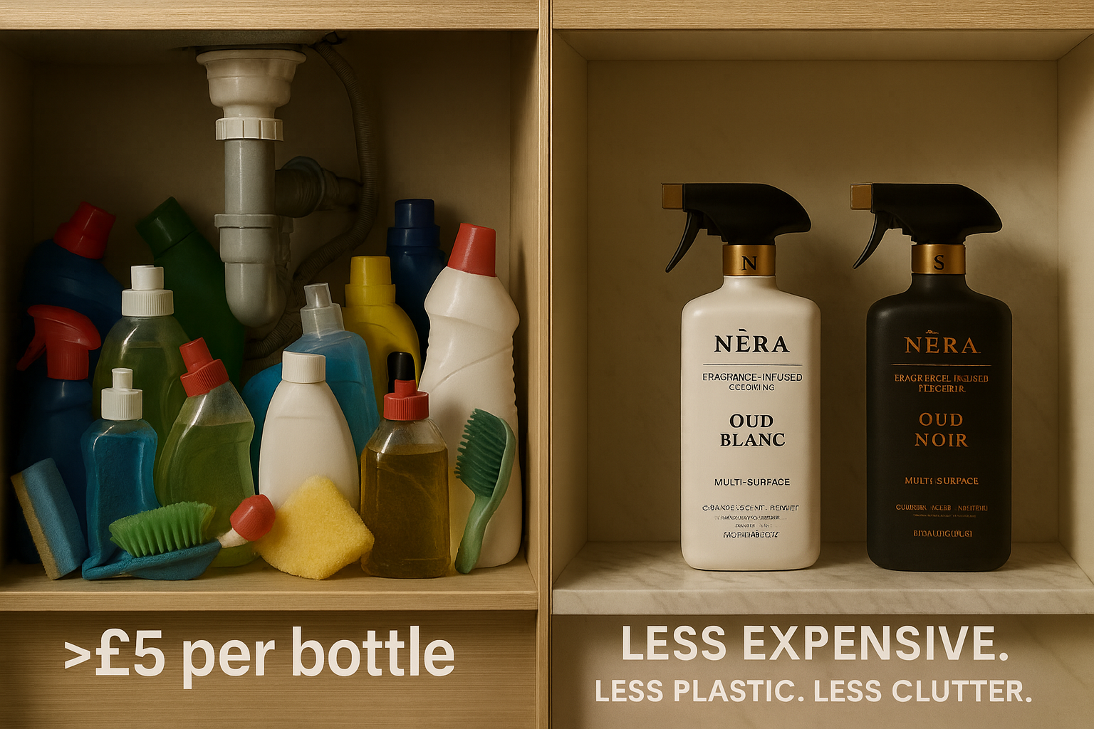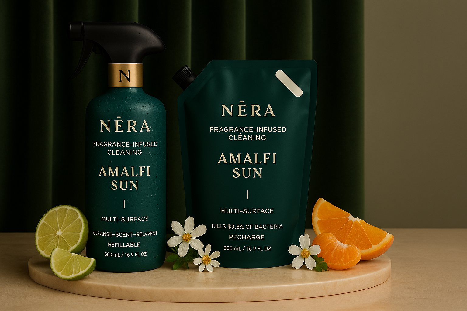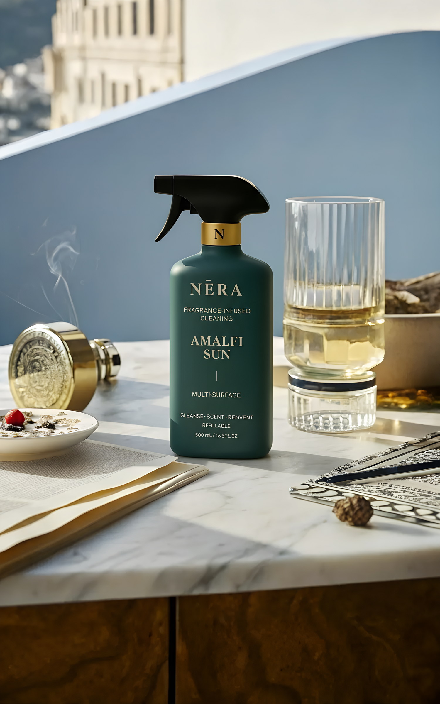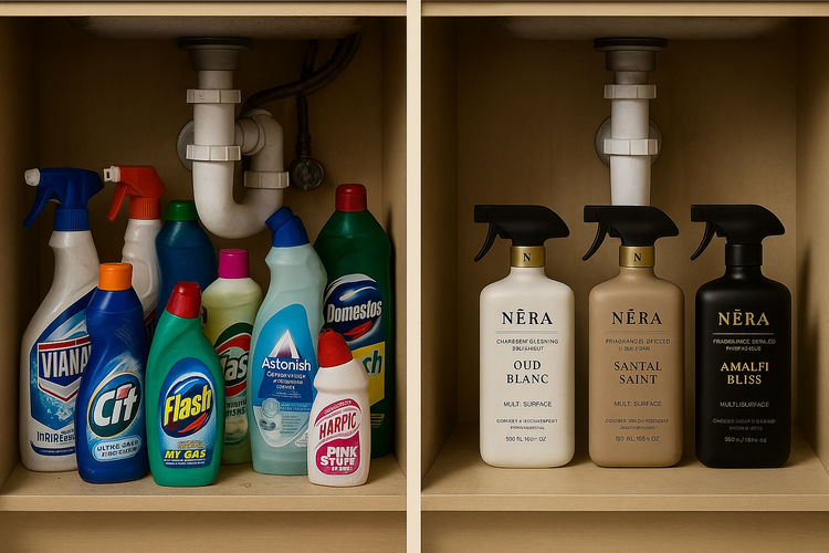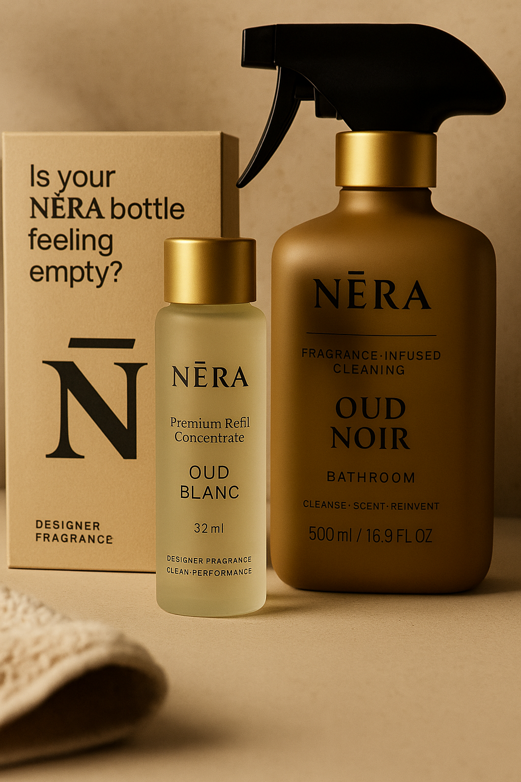 We were too. So we birthed NĒRA - Break away from cluttered cleaning cabinets. A sophisticated cleaning system that kills germs, eliminates visual clutter, and converts cleaning into a ritual. Refillable. Plant-based. Designer-scented. No compromises.